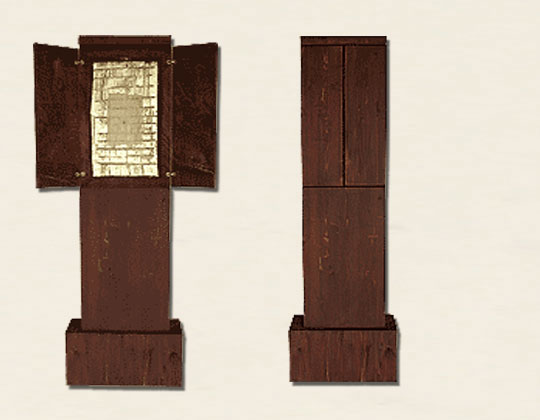 Abmessungen: 1250 x 360 x 160 mm Material: Kiefer, blockverleimt Herstellung: Aus dem vollen Holz gesägt, bzw. gehauen. Oberfläche: Außen gebeizt und geölt, innen blattvergoldet.